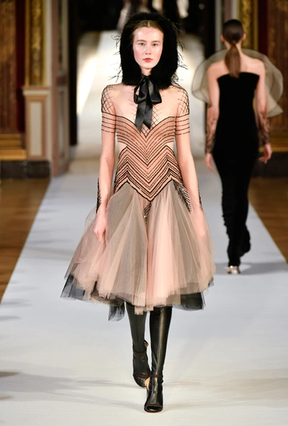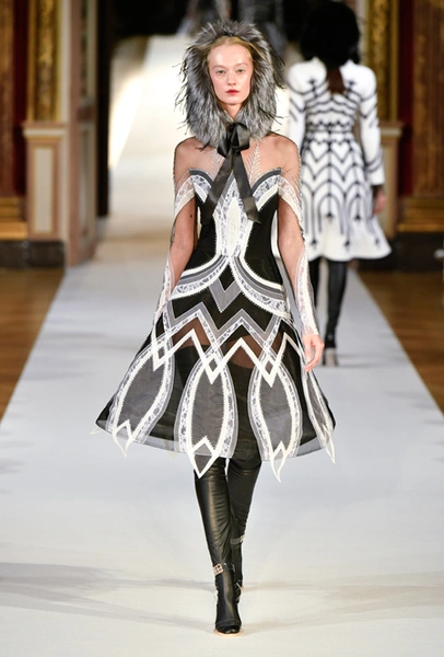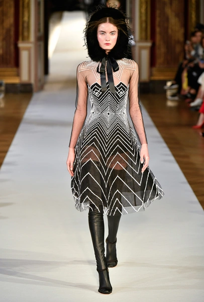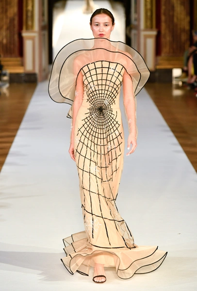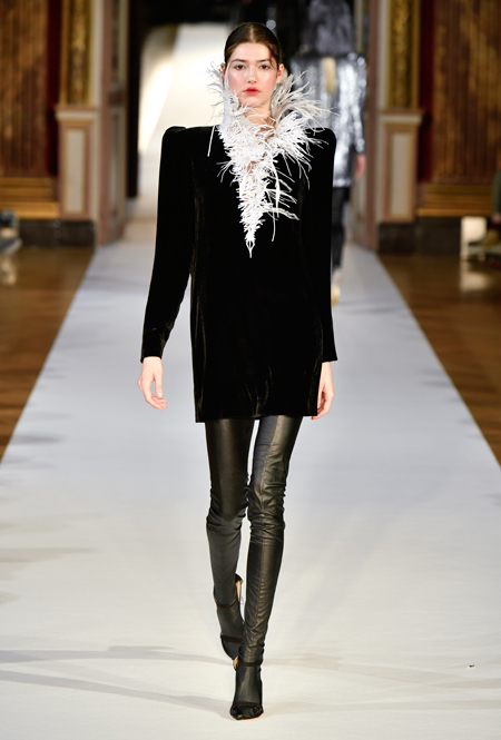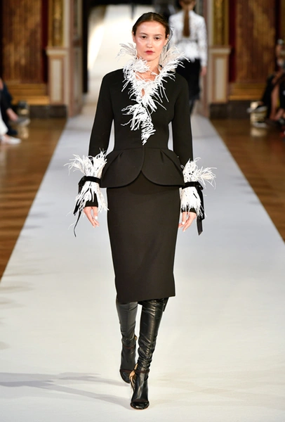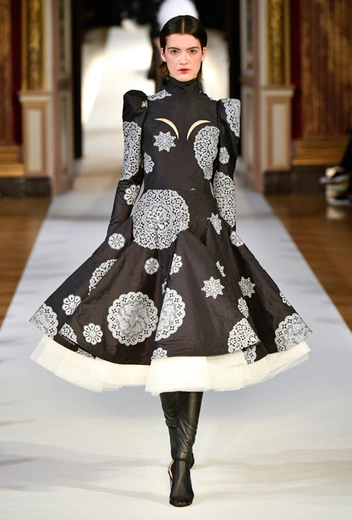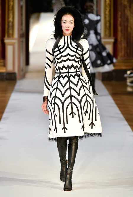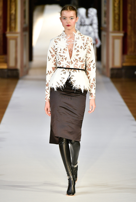 Главное впечатление от коллекции – здесь все четко, выверено, графично. Начиная от силуэтов и заканчивая принтами, которые напоминают строгие карандашные рисунки. Кое-где мягкости силуэтам добавляют крупные оборки (самая эффектная, круглая, украшает декольте одного из платьев) или бахрома, которой расшит, например, ворот тех самых платьев в стиле 80-х годов. Кстати, если приглядеться внимательнее, эта «бахрома» окажется жесткой, похожей на застывшие, покрытые инеем ветки – эффект, созданный с помощью уникальной технологии, изобретенной в Доме моды Юлии Яниной.