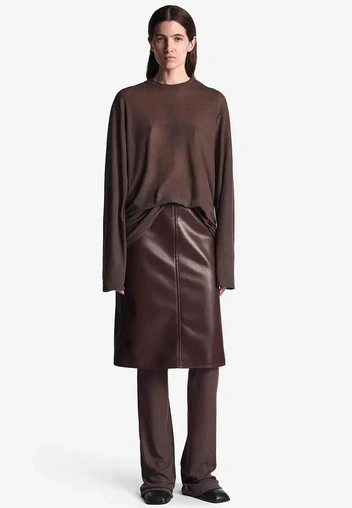 Женственный акцент: юбка из твида, шерсти, кожи или платье-кокон и платье-свитер. Юбка в сочетании с колготками из кружева и ботильонами или сапогами-ботфортами создаст в полной мере стильный и теплый силуэт. Это ваш козырь для событий, где хочется выглядеть особенно. Вещи выбирайте из плотных, теплых тканей, в универсальных оттенках (читайте также: Юбка-карандаш — ваш мастхэв на эту зиму (где купить и как стилизовать)).