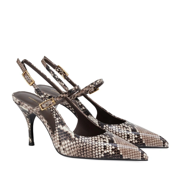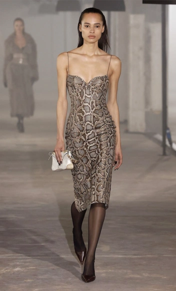 Менее вместительные модели сумок тоже были популярны на прошедших шоу, и главной моделью тут до сих пор остается такса с длинными ручками и вытянутым овальным или прямоугольным дном. Alaia показали сумку Le Teckel на шоу весна-лето 2024, и по сей день этот фасон не сходит с модных радаров. Если говорить о вечерних опциях, рассмотрите клатчи — Ferragamo в сезоне осень-зима 2025/26 сделал их большем размере, а значит функциональнее. К слову, никто не запретит вам сочетать два варианта змеиного принта в одном образе — но тут важно чувствовать объемность фактуры. Например, размытый темный змеиный узор на туфлях станет хорошей рифмой к четкому, но более светлому рисунку чешуи на сумке.