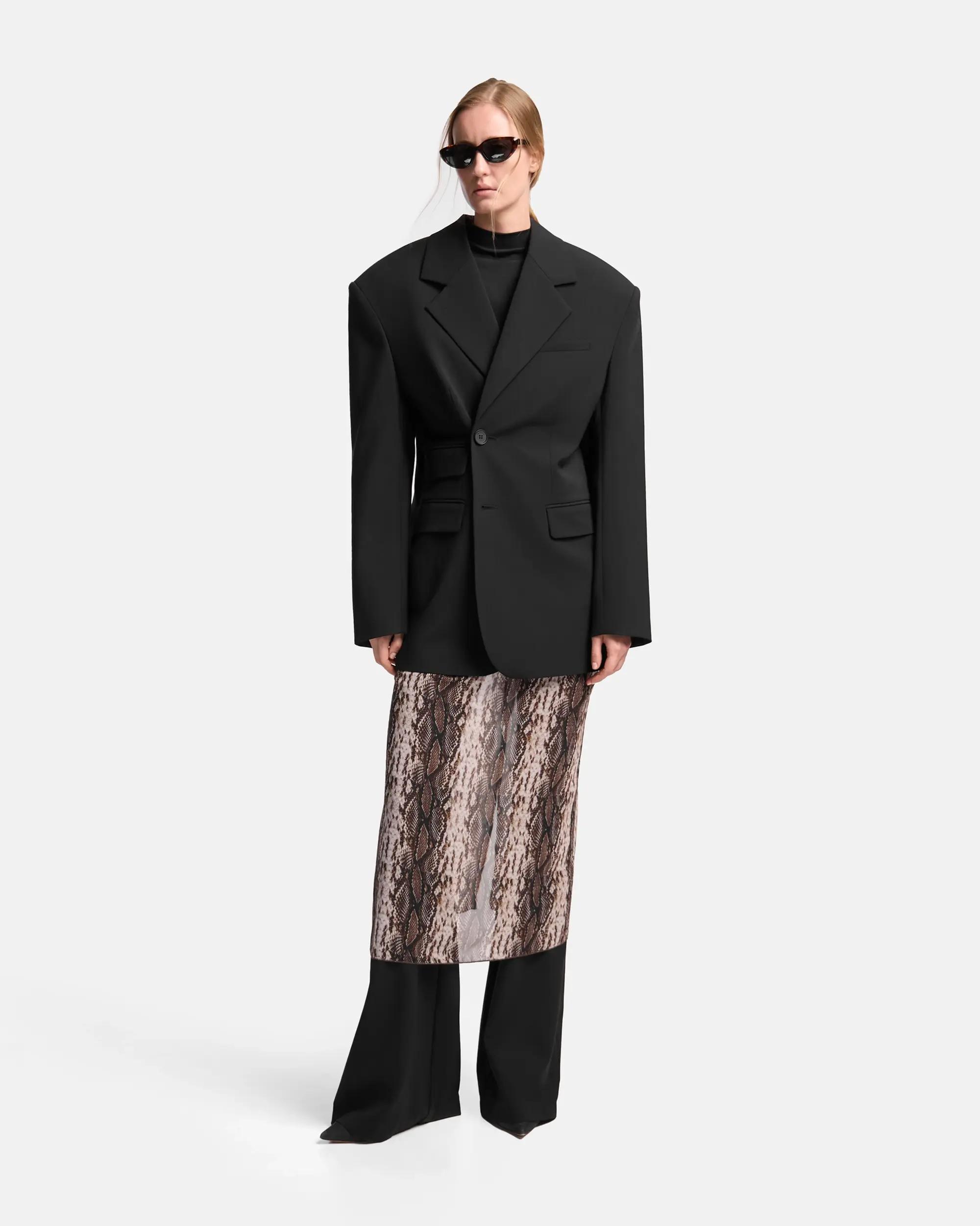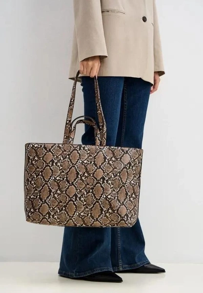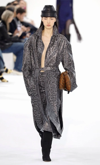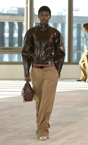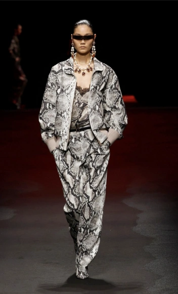 В игру со змейкой на Неделях моды осень-зима 2025/26 решили поиграть как дизайнеры с именем, так и те, кого в кокетстве с массовым трендом никогда не заподозришь. Укороченные кожаные куртки в стиле нулевых представили Kim Sui и Dilara Fendikoglu и выглядит это свежо и в меру экстравагантно — даже если весь образ не будет выдержан в эстетике 10-х годов, куртка с активным принтом может стать базовым ярким штрихом. В коже, выкрашенную под змеиную, выполнен стиль плащей и сумок шоперов от Sportmax. Пробрался анималистический узор и в коллекции Resort 2026: на брюки Louis Vuitton, сумки-ведра и даже портфели Khaite — новый взгляд на стиль офисной сирены.