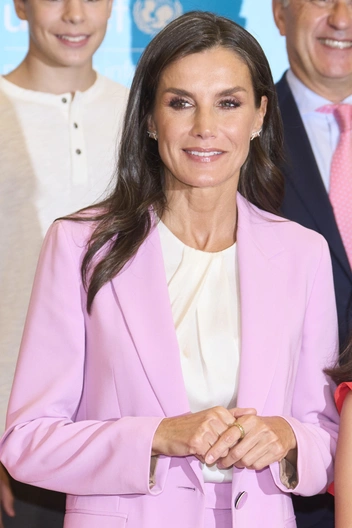 7 сентября на вручении премии ЮНИСЕФ в Мадриде испанская королева Летиция выглядела изящно в костюме светло-сиреневого пастельного оттенка. Сшитые на заказ брюки-сигареты королевы заканчивались чуть выше лодыжек, а сверху заметную талию выгодно подчеркнул пояс. Пуговицу элегантного блейзера от костюма Летиция решила оставить расстегнутой, чтобы создать более непринужденный образ. Под блейзер Летиция выбрала простую белую футболку с круглым вырезом, а в качестве аксессуара дополнила образ золотыми остроносыми туфлями на высоком каблуке.