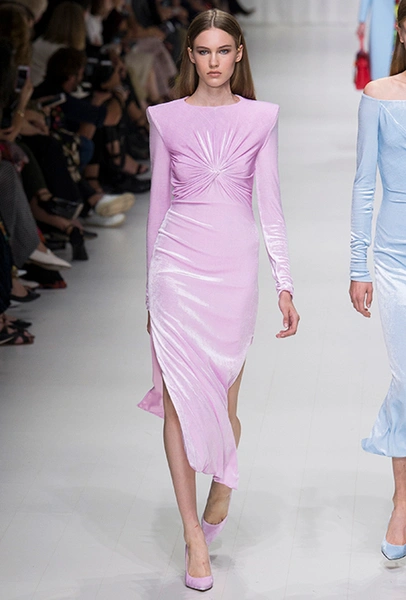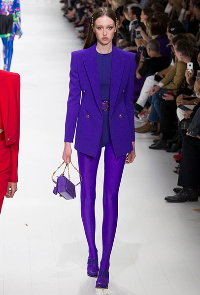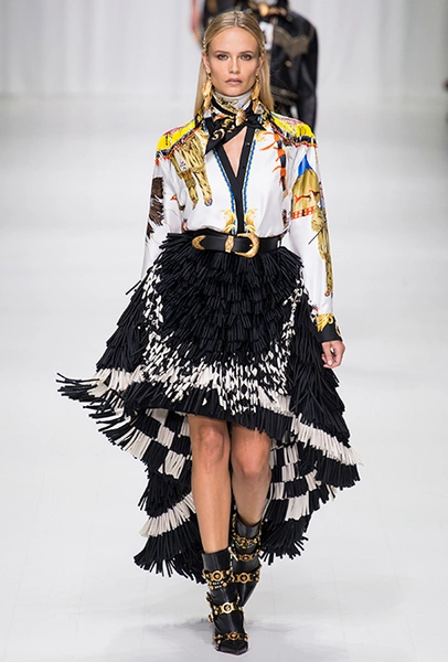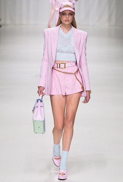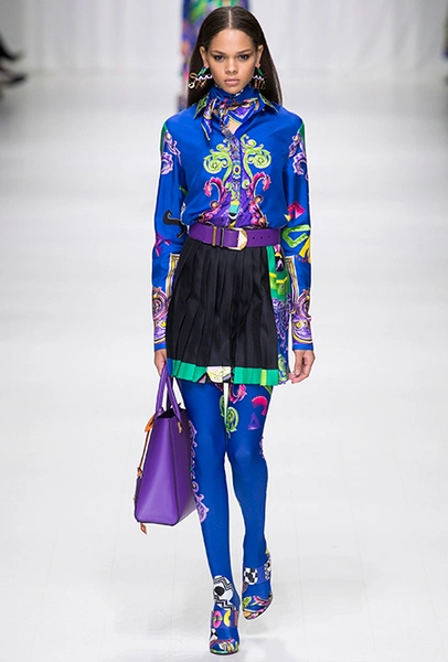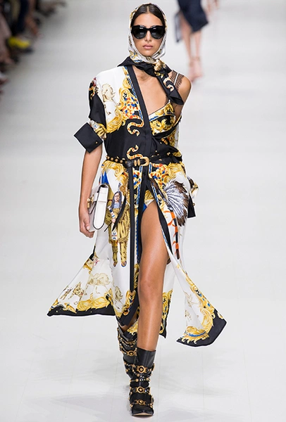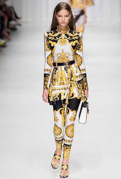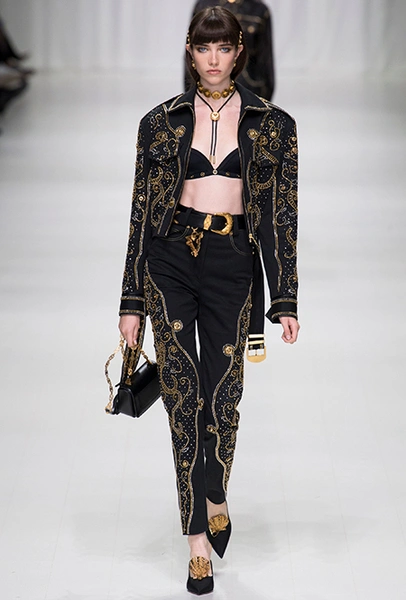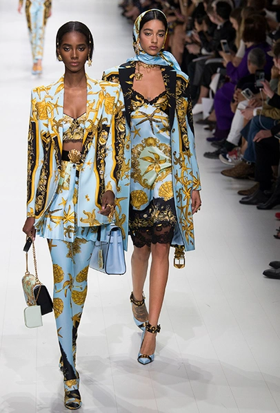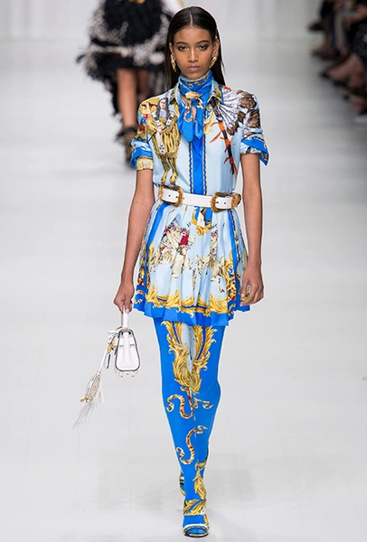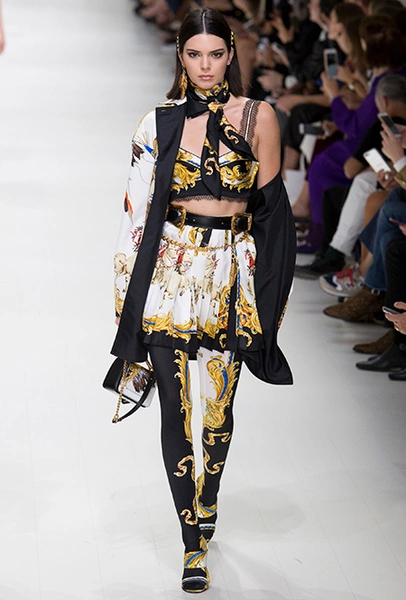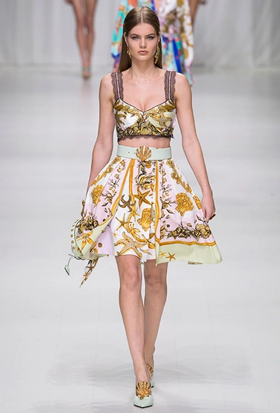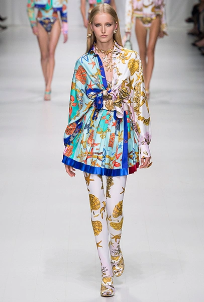 Нынешний показ во многом отсылал к 90-м, золотому во всех смыслах веку Versace. В коллекции есть шёлковые пижамы с тем самым принтом из золотых цветов и корон. Похожим узором с некоторыми вариациями (например, иногда сюда вплетается античный пегас) покрыты ультракороткие топы, юбки в складку, жакеты с жесткими плечами и даже колготки.