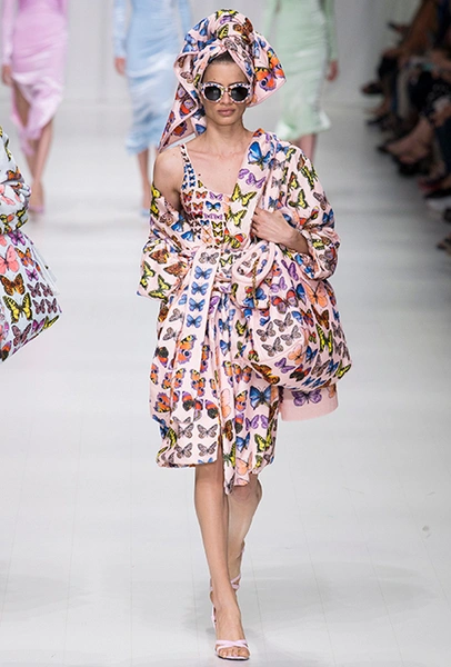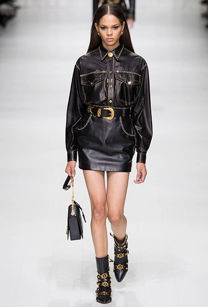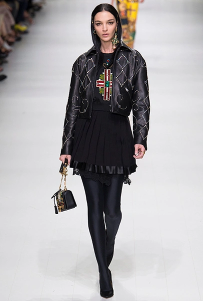 Графичные жакеты из чёрной кожи и денима добавляют коллекции практичности. Строгими их, конечно, не назовёшь. Все в них немного «слишком» – и широкие плечи и огромные накладные карманы – но тем не менее в них уже можно жить и, возможно, ходить на работу, а не только пить шампанское на вилле у знакомого миллионера. Особенно эффектно эти вещи миксуются с «золотыми». Например, темно-синяя рубашка отлично уравновешивает пеструю пышную юбку на кружевной подкладке, а платок с ярким принтом смотрится ещё эффектнее, если на модели чёрный тренч «с плечами».