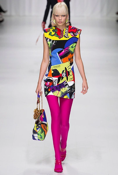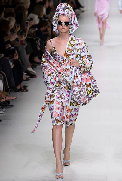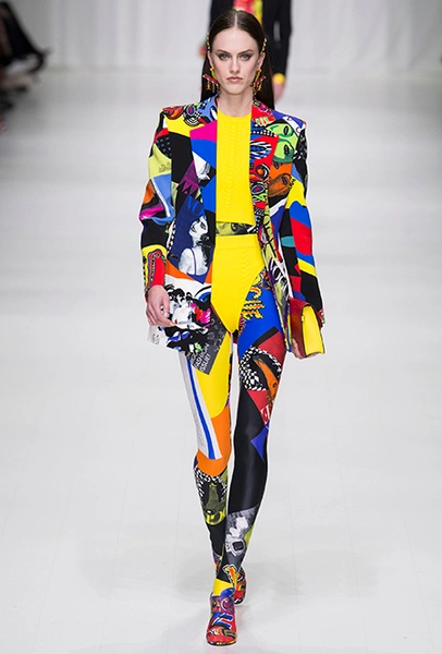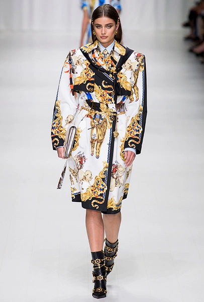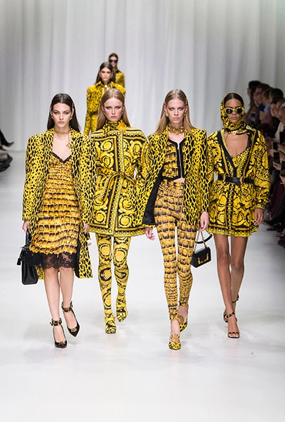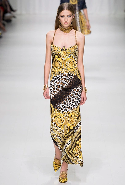 Кое-где это буйство разбавленно другим буйством – принтом в виде ярко-желтого и коричневого «леопарда». Иногда все эти узоры сочетаются в одной вещи, а чтобы мало никому не показалось, Донателла завершает образы массивными золотым колье или браслетами в виде тяжелых позолоченных цепей. Чтобы носить такие вещи надо быть не только платёжеспособной, но и смелой. В век, когда в моде минимализм и отказ от потребления на показ, Versace продолжает дерзко гнуть свою линию и прославлять роскошь, изобилие и joie de vivre в стиле обитателей Олимпа (не зря марка так любит отсылки к античности). Выглядит само по себе как провокация.