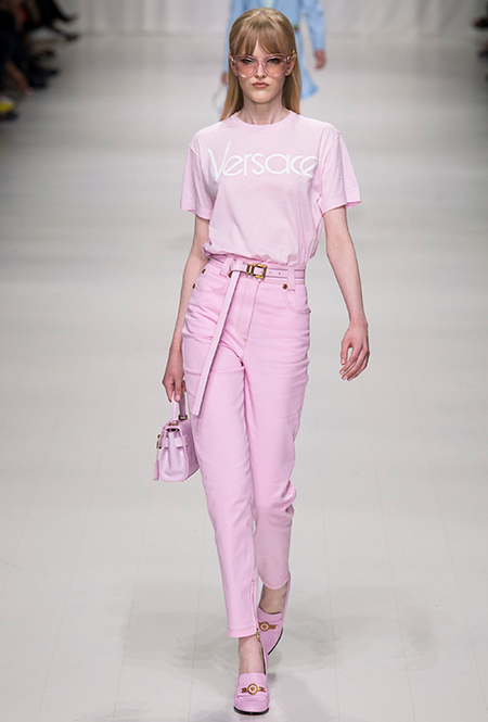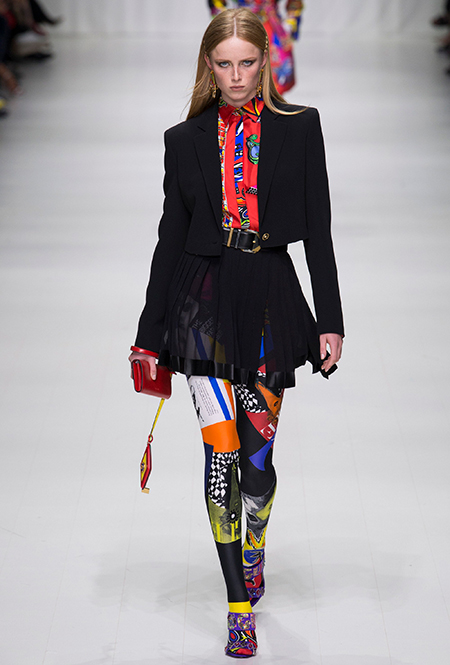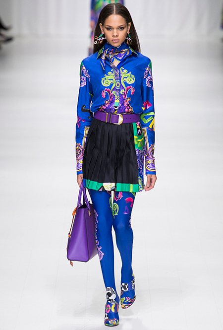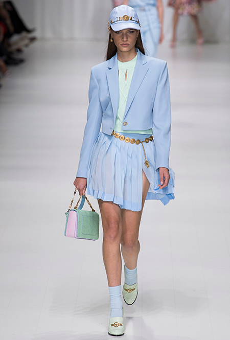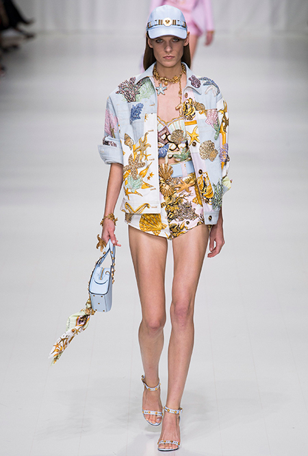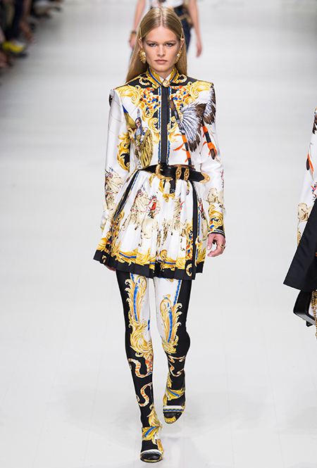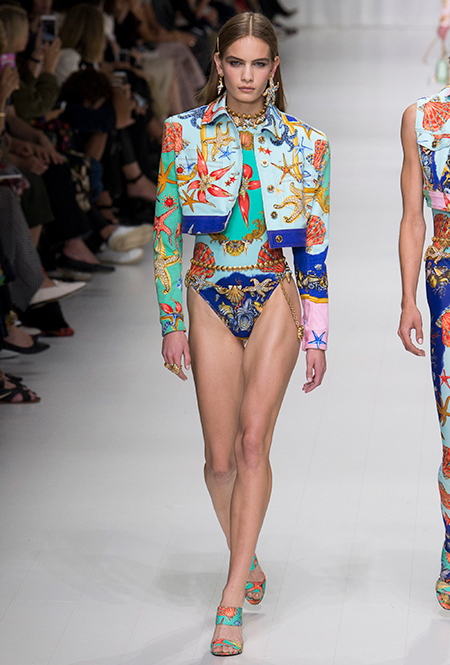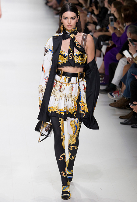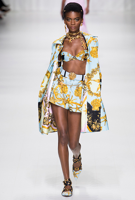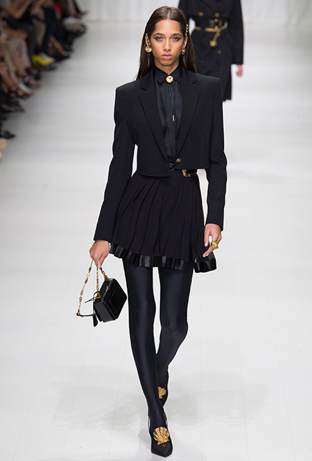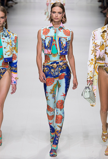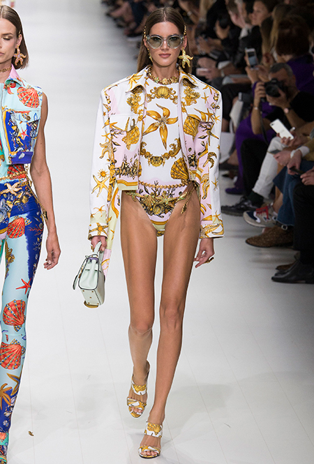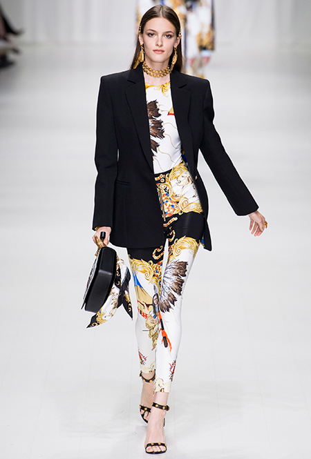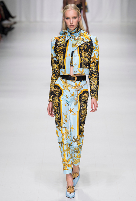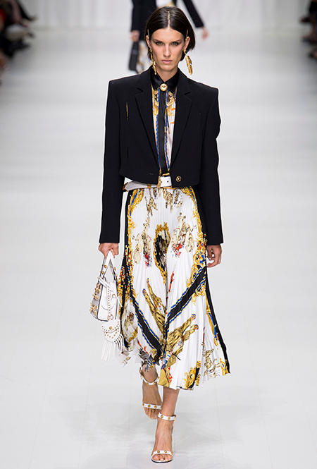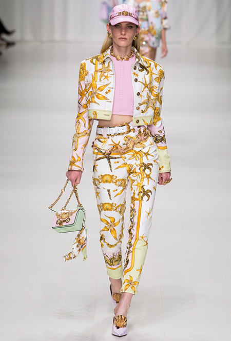 Нынешний показ во многом отсылал к 90-м, золотому во всех смыслах веку Versace. В коллекции есть шёлковые пижамы с тем самым принтом из золотых цветов и корон. Похожим узором с некоторыми вариациями (например, иногда сюда вплетается античный пегас) покрыты ультракороткие топы, юбки в складку, жакеты с жесткими плечами и даже колготки.