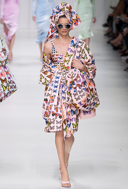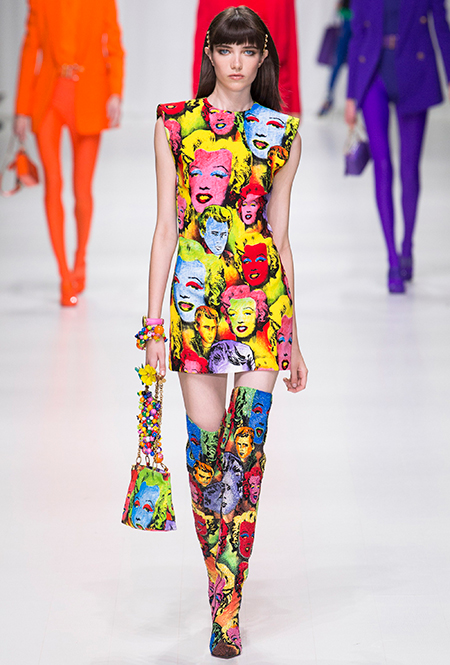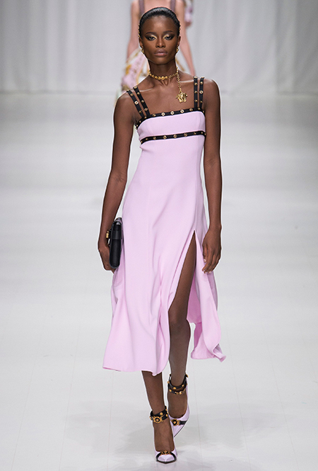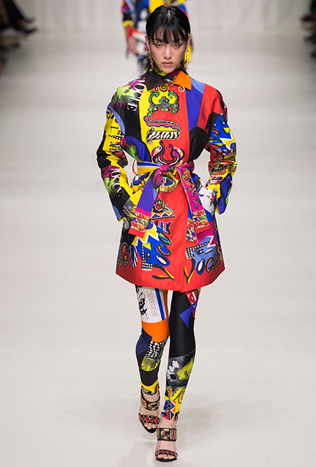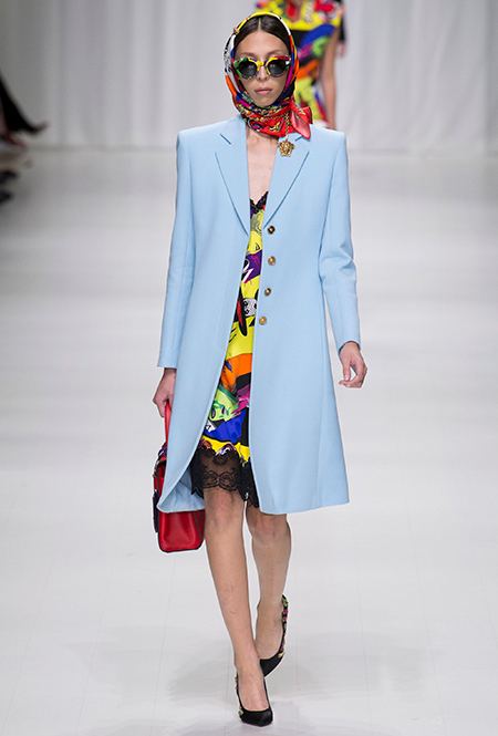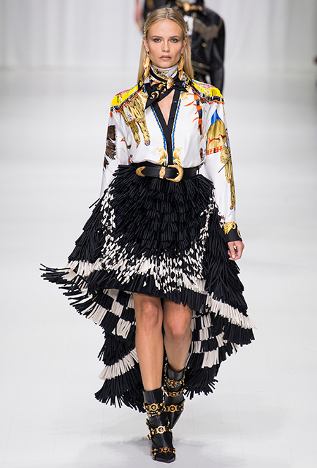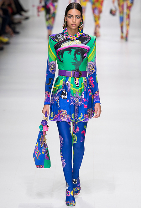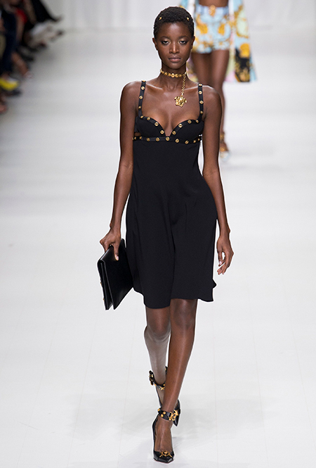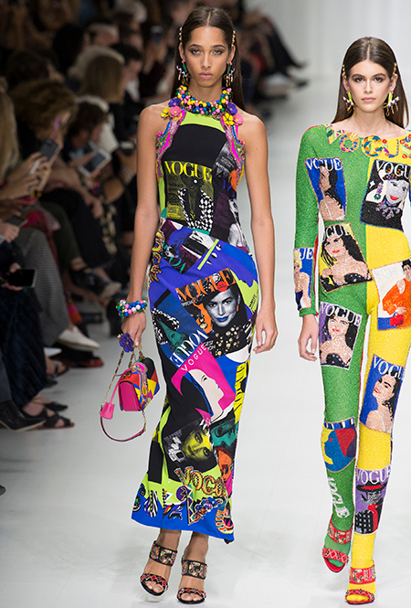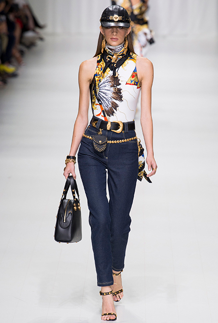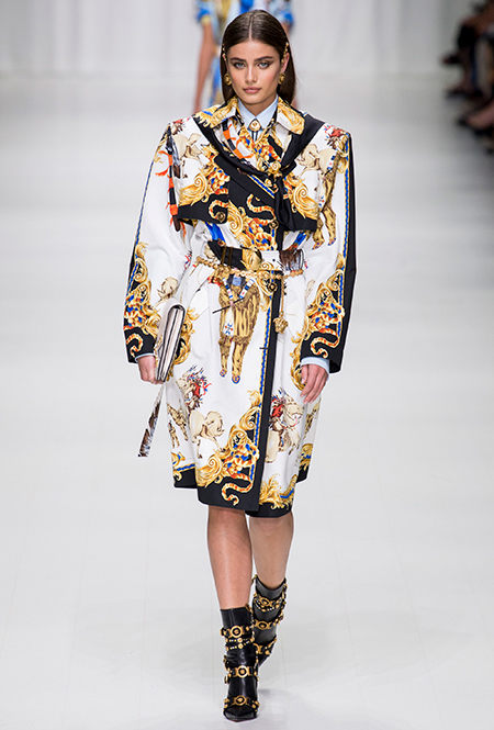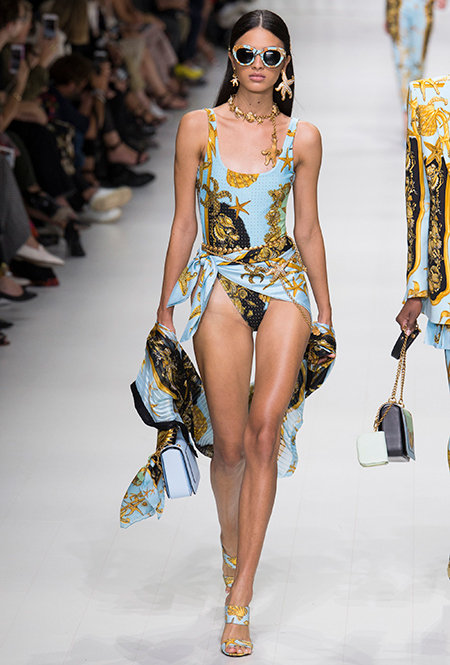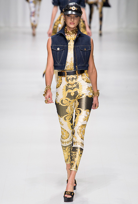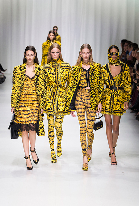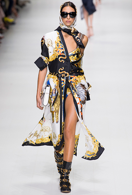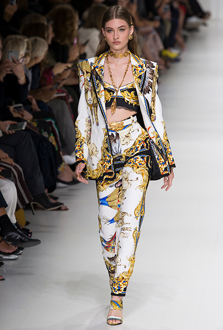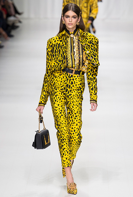 Кое-где это буйство разбавленно другим буйством – принтом в виде ярко-желтого и коричневого «леопарда». Иногда все эти узоры сочетаются в одной вещи, а чтобы мало никому не показалось, Донателла завершает образы массивными золотым колье или браслетами в виде тяжелых позолоченных цепей. Чтобы носить такие вещи надо быть не только платёжеспособной, но и смелой. В век, когда в моде минимализм и отказ от потребления на показ, Versace продолжает дерзко гнуть свою линию и прославлять роскошь, изобилие и joie de vivre в стиле обитателей Олимпа (не зря марка так любит отсылки к античности). Выглядит само по себе как провокация.