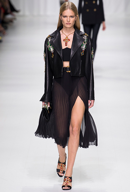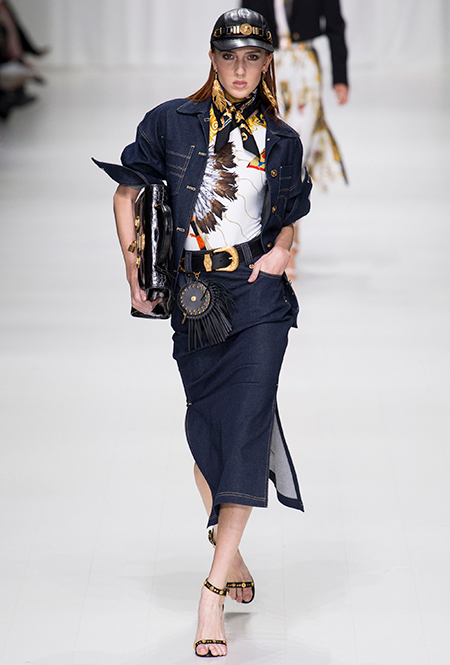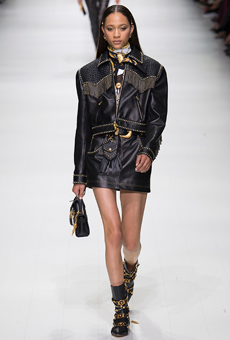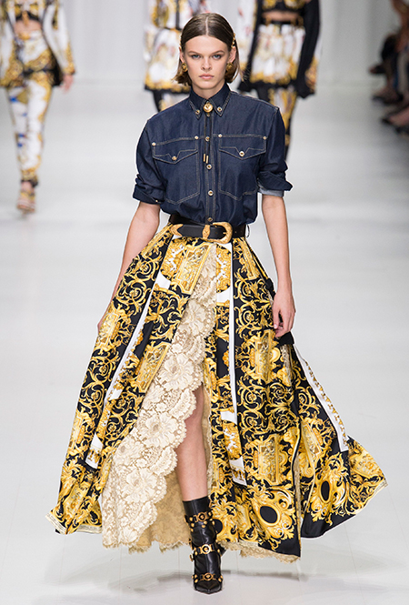 Графичные жакеты из чёрной кожи и денима добавляют коллекции практичности. Строгими их, конечно, не назовёшь. Все в них немного «слишком» – и широкие плечи и огромные накладные карманы – но тем не менее в них уже можно жить и, возможно, ходить на работу, а не только пить шампанское на вилле у знакомого миллионера. Особенно эффектно эти вещи миксуются с «золотыми». Например, темно-синяя рубашка отлично уравновешивает пеструю пышную юбку на кружевной подкладке, а платок с ярким принтом смотрится ещё эффектнее, если на модели чёрный тренч «с плечами».