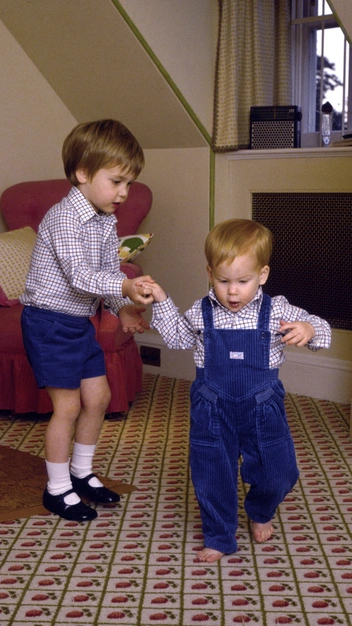 Также сыновей наследников запечатлели в их детской в резиденции Уэльских в Лондоне. На снимках видно, как трогательно старший брат поддерживает младшего, когда тот учится ходить. У малышей также были две лошадки-качалки, соответствующие их возрасту, чтобы они могли кататься вместе.