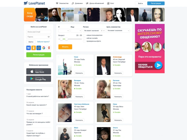 Этот дейтинг-старожил (работает с 2005 года) сохраняет большую аудиторию по сей день. Сервис знакомств помогает найти и пару, и друзей по интересам. На сайте есть разделы по целям общения: «для брака и создания семьи», «для любви и серьезных отношений», «для флирта», «для секса», «для велопрогулок», «для путешествий» и многие другие, среди которых вы точно найдете то, что вам нужно.