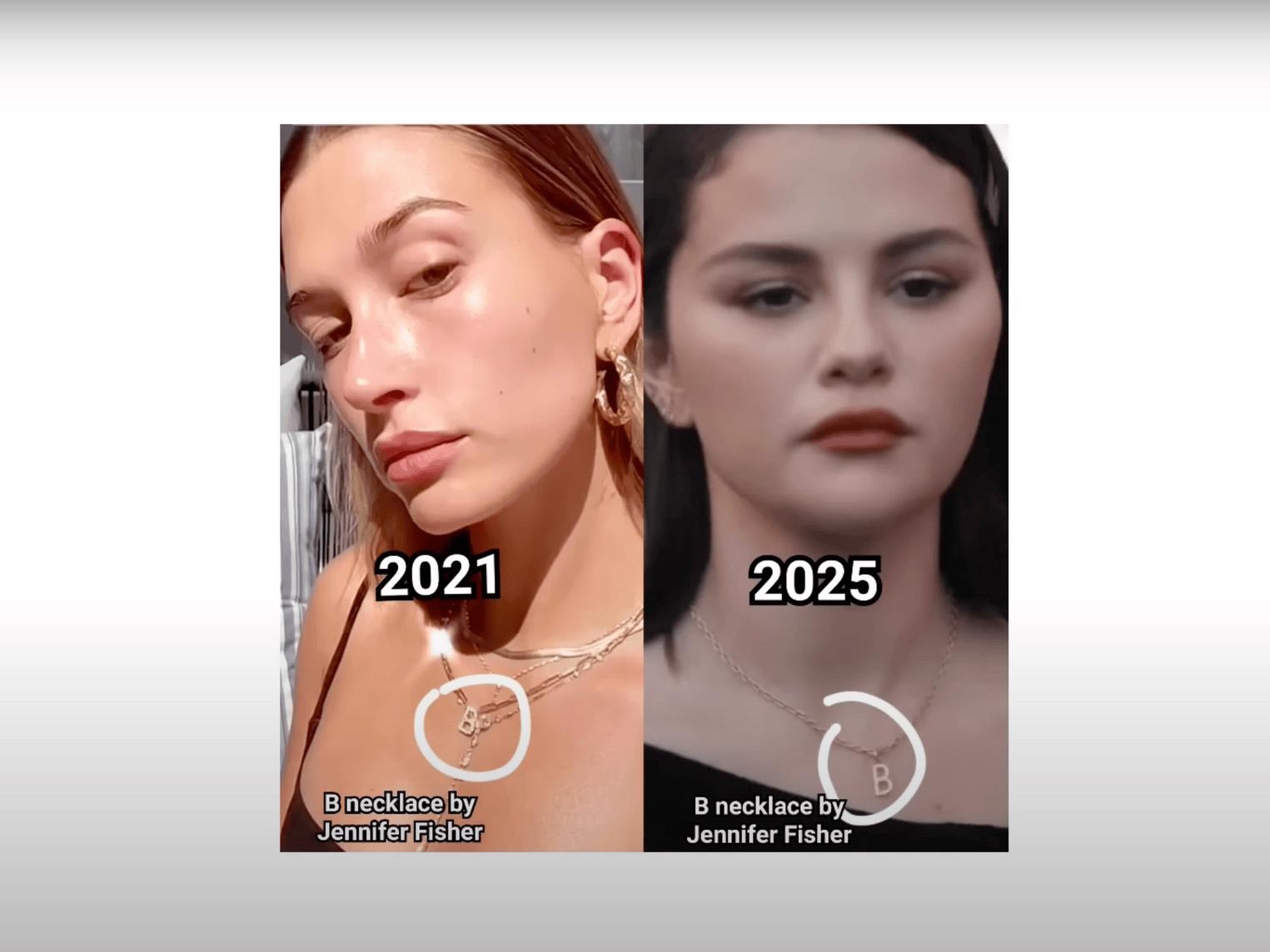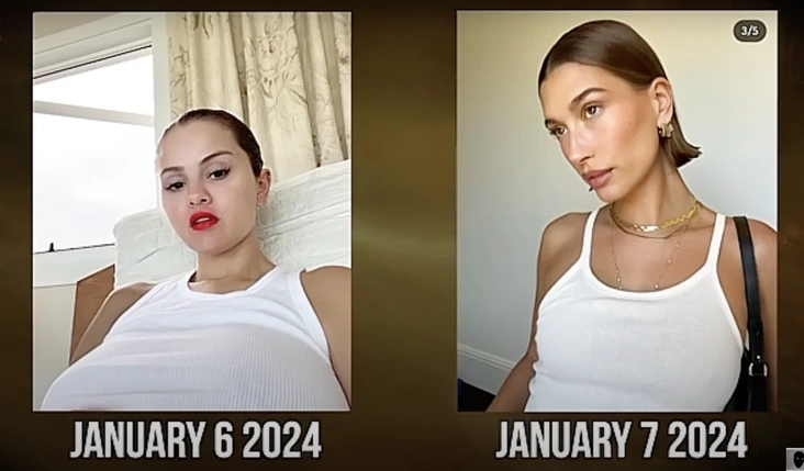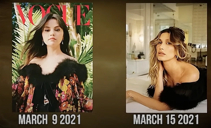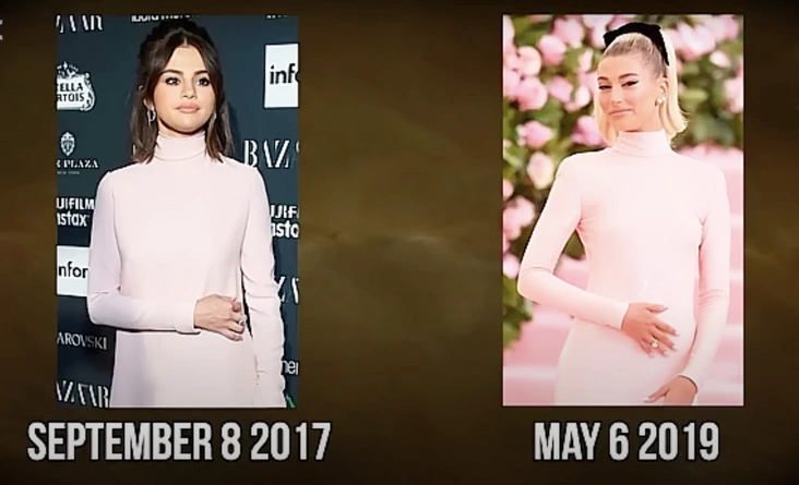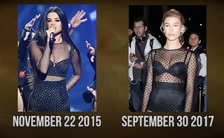 Стоит отдать должное интернет-расследователям: далее они действительно провели достаточно серьезную работу, проанализировав официальные аккаунты Селены и Хейли, их публичные выходы и все появившиеся в сети фотографии знаменитостей за несколько лет. Что же выяснилось в итоге? То, что Хейли многократно и последовательно копировала Селену — от отдельных аксессуаров и выражений лица до целых аутфитов поз на кадрах. Сама по себе каждая деталь могла показаться случайной, но в совокупности создавалась более настораживающая картина.