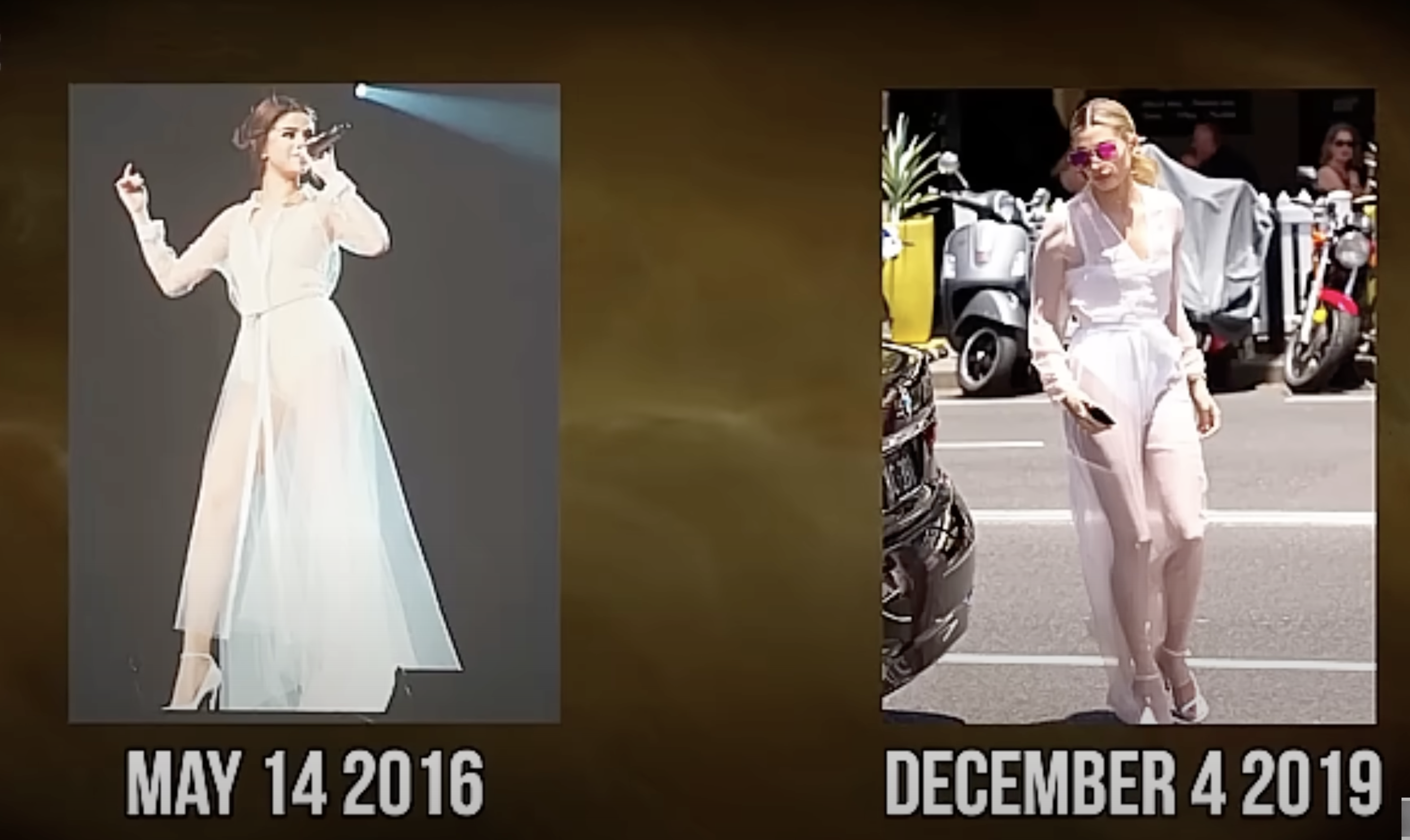 Далее в видео утверждается, что первое зафиксированное знакомство Хейли и Джастина — за кулисами шоу Today Show — не было их первым контактом: мол, есть фото, где она стоит в толпе на его концерте в Рокфеллер-Плаза. Однако эти события произошли в один и тот же день. Просто концерт был утром, а знакомство — позже вечером. Это легко проверить, присмотревшись к одежде и прическам Хейли и Джастина.