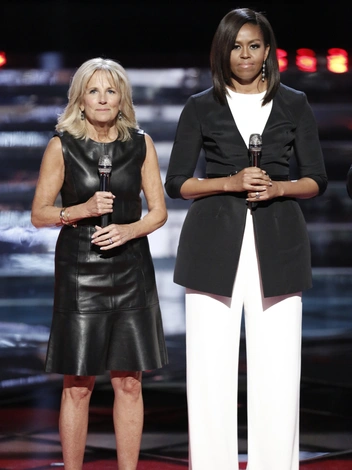 После этого доктора Байден и миссис Обама видели вместе в еще более непривычных декорациях. В честь пятой годовщины национальной инициативы Joining Forces, поддерживающей военнослужащих, ветеранов и их семьи, жены политиков появились на американском конкурсе «Голос». На Мишель был эффектный черно-белый комплект, а Джилл надела на телешоу черное кожаное платье и синие босоножки, чем произвела настоящий фурор.