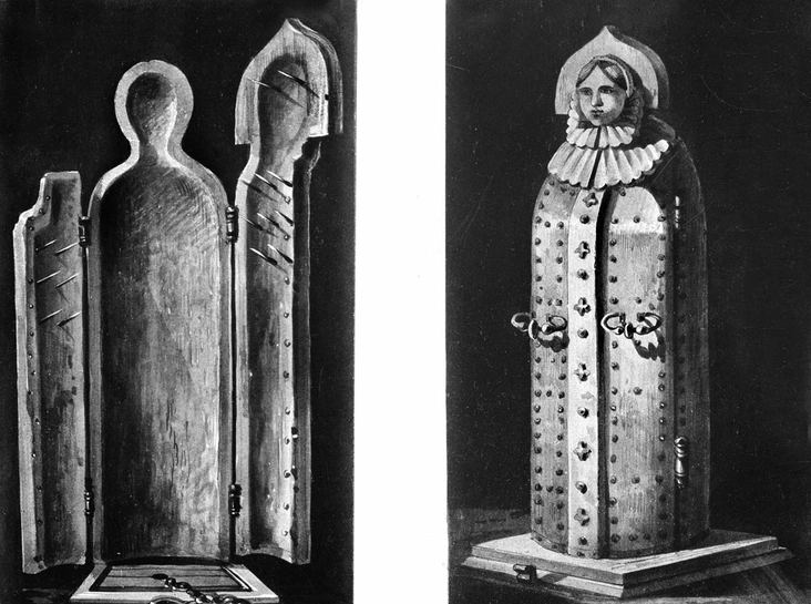 Апогеем кровавой мессы Эржебет стало приобретение орудия пыток под названием «Железная дева» — это некий шкаф, по форме напоминающий женскую фигуру, створки которого были утыканы острыми шипами. Девушку помещали внутрь шкафа, после чего дверки закрывались, и она попадала в кровавые объятия «Девы». Шипы были расположены таким образом, что пронзали тело жертвы в тех местах, где не было жизненно важных органов, чтобы жертва умирала медленно. Внизу шкафа находились трубки, которые выводили всю собранную кровь в нижнее помещение с купальней графини.