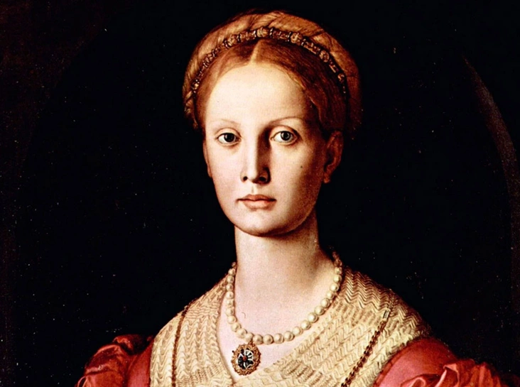 Этот портрет был написан в 1540-м году итальянским художником Аньоло Бронзино — за двадцать лет до рождения Эржебет. По всей видимости, строгое выражение лица Лукреции, ее высокомерие и надменность, утонченная фигура, раскрытая на коленях книга (возможно, дневник), красное платье и ее аксессуары породили мрачные образы в воображении наших современников.
