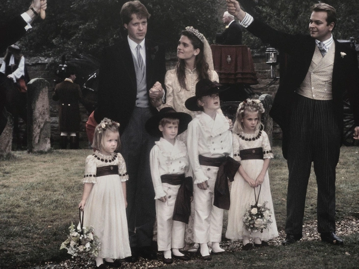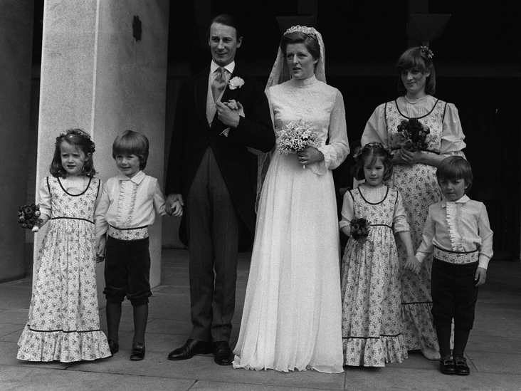 Это милое торжество в стиле 1970-х — свадьба старшей сестры принцессы Дианы леди Джейн Спенсер и Роберта Феллоуза. Дочь Джона и Фрэнсис Спенсер пошла под венец в фамильной тиаре Спенсеров, и позже эту традицию поддержали ее сестры. Кстати, узнали ли вы в девушке справа в блузе с пышными рукавами и сарафане в цветочек одну из них — совсем юную леди Диану?
