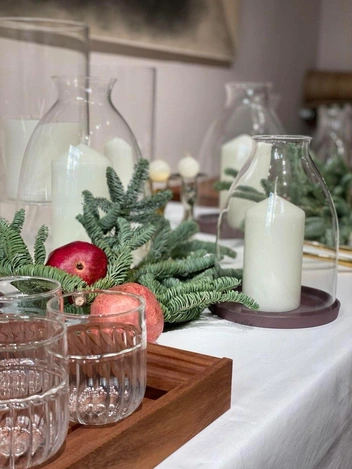 Для того, чтобы избежать массивных конструкций, выбирайте сеты из индивидуальных подсвечников. Будет очень красиво, если собрать на подносе несколько разных и зажечь тонкие конусообразные свечи разной высоты. Такая композиция будет выглядеть архитектурно и графично. И еще один совет — не забывайте, что парфюмированных свечей на общем столе быть не должно. Это вопрос и возможной аллергии у гостей, и личного отношения к ароматам.