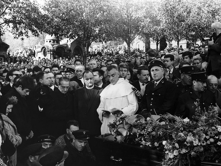 О том, что легендарная исполнительница умерла, публика узнала лишь 11 октября, когда ее тело было перевезено в родной Париж. Именно в этот день ушел из жизни ее ближайший друг и верный спутник Жан Кокто — многие полагают, что именно известие о том, что Пиаф не стало, явилось причиной его гибели. Для прощания с легендой на кладбище Пер-Лашез пришло более сорока тысяч человек, в результате чего движение в Париже полностью остановилось. А в 2013 году, несмотря на запрет кардинала Мориса Фелтина на проведение поминальной мессы, Римско-католическая церковь нарушила это предписание и провела прощальную службу в церкви Св. Жан-Батиста в Бельвиле, Париж, в приходе, где она родилась.