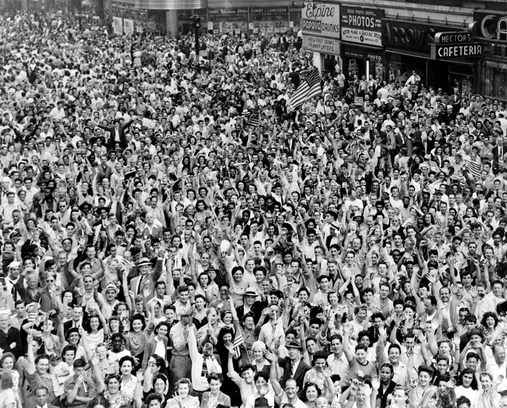 День победы во Второй мировой войне был одним из самых ярких в каждой стране-участнице этого страшного и долгого вооруженного конфликта. Правда, если в России до сих пор громко отмечают 9 мая — день окончания Великой Отечественной войны, то в Америке такой датой стало 14 августа 1945 года. Именно тогда в своей речи президент Трумэн объявил о капитуляции Японии, и люди стали массово выходить на улицы Нью-Йорка.