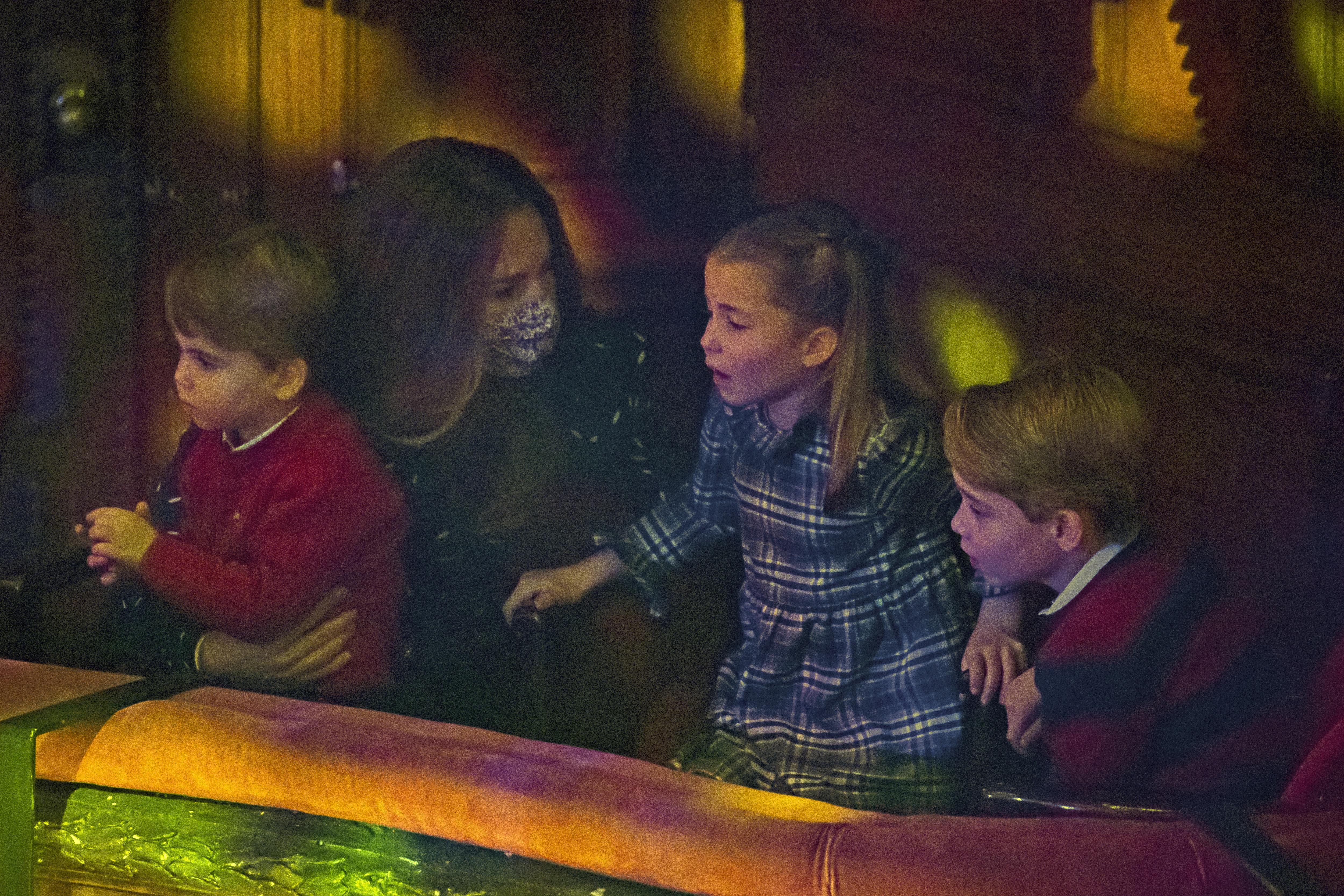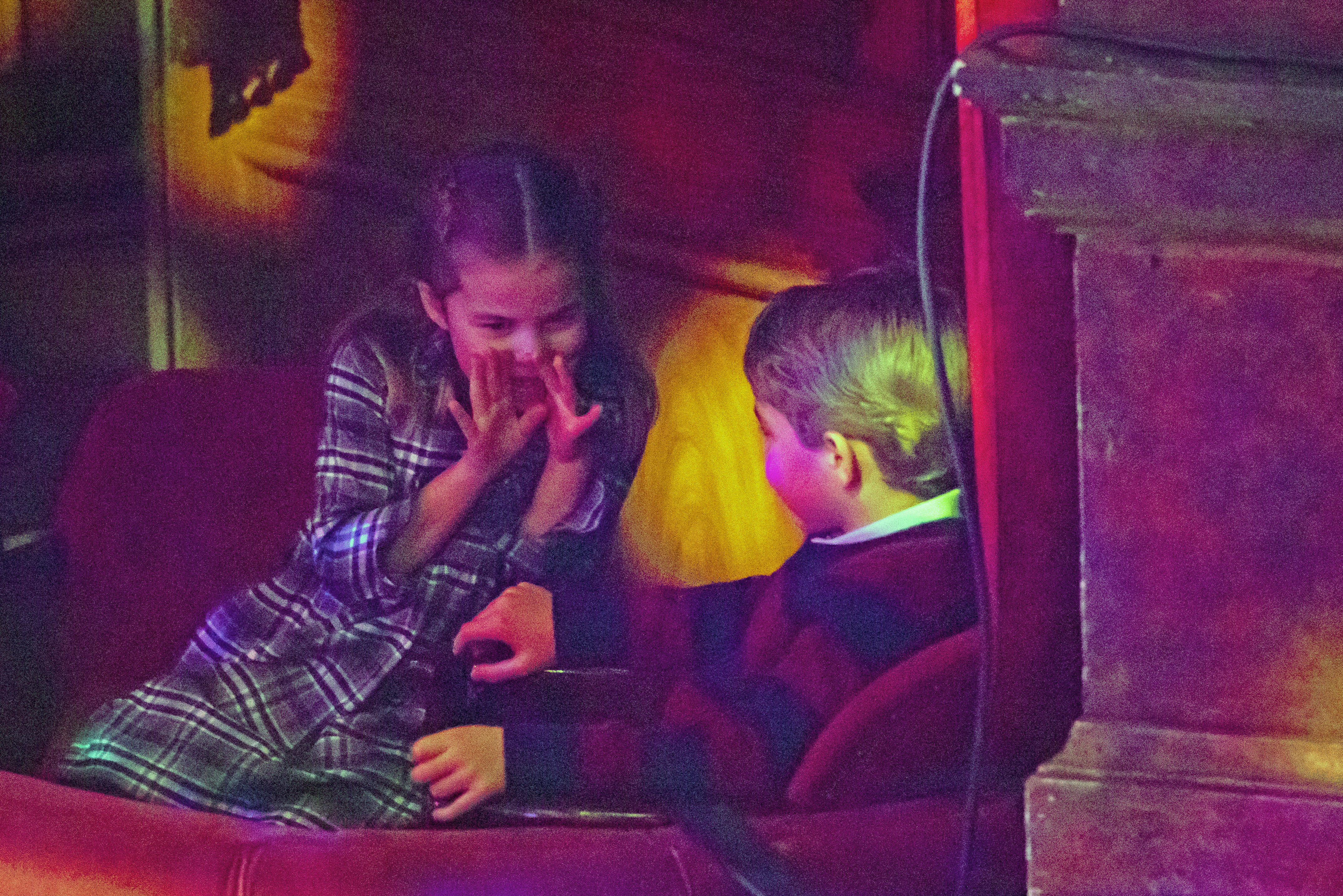 Во время самого представления Шарлотте было явно трудно усидеть на месте. Она привставала со своего кресла, пытаясь получше разглядеть происходящее на сцене, обнимала свою маму и младшего брата Луи и что-то заговорщически шептала старшему — Джорджу.
