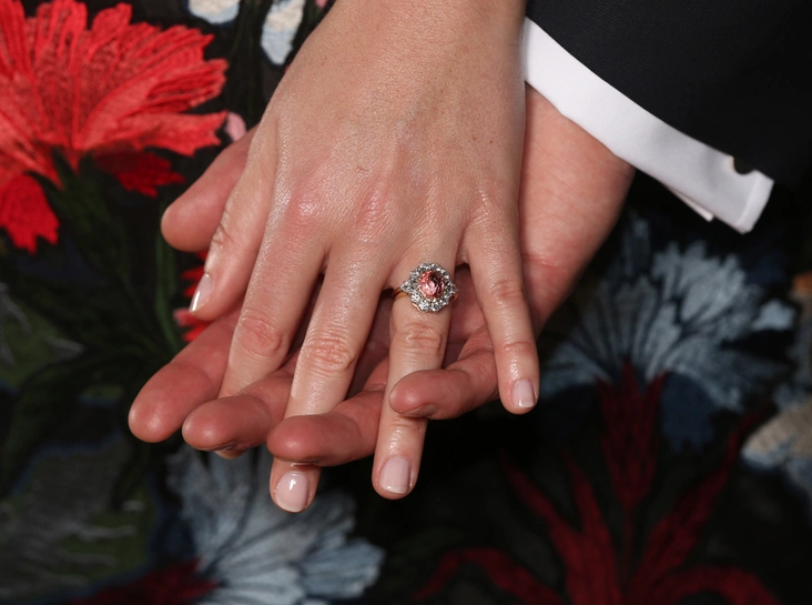 Предложение в Никарагуа, конечно, было спонтанным, и, тем не менее, «то самое» кольцо у молодого человека уже было наготове. Как и многие виндзорские женихи до него, сначала Джек нашел камень – причем, здесь возлюбленный Евгении явно превзошел всех, ведь его выбор пал на необычный оранжево-розовый сапфир папаражда (такие самоцветы не сверкали еще ни в одном королевском кольце, читайте: «Помолвочные кольца Виндзоров: проклятый рубин, кармический сапфир и порочный изумруд»). Традиционно этот камень можно найти только на Шри-Ланке, а в сингальском языке его название означает «цветок лотоса». Самоцвет переливается чуть ли ни всеми теплыми оттенками спектра, так что не исключаем, что любуясь закатом в Никарагуа, Джек невольно вспомнил о красоте помолвочного камня для Евгении и уже не стал тянуть с вопросом.