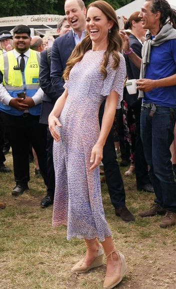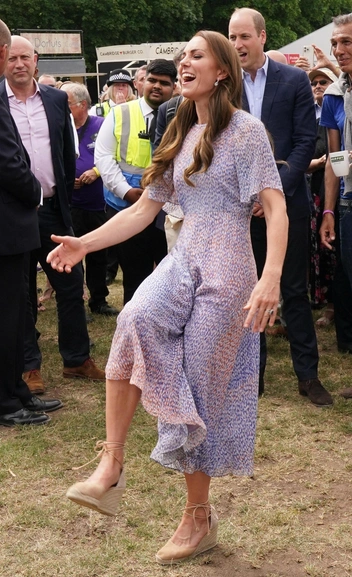 Уэльские сыграли в футбол во время визита в Кембриджшир. Несмотря на обувь на платформе и длинное платье, герцогиня с первого раза попала в ворота — на радость мужа и собравшихся людей.