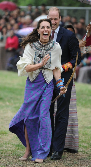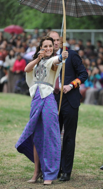 В 2016 году принц Уильям и Кэтрин освоили национальный вид спорта Бутана — стрельбу из лука. Когда пара несколько раз промахнулась мимо цели, им разрешили стоять чуть поближе — но и это не помогло. Окружающих впечатлил наряд Кейт: она не стала снимать туфли на каблуке и платье ручной работы.