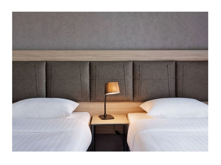 Гостиная – это центр событий, рабочая станция, трансформируемая в зону вечерних развлечений, видеостена с Instagram-фотографиями (запрещенная в России экстремистская организация) гостей Moxy со всего мира, зона общения Plug and Meet. Бетон, витражное стекло в пол, арт-объекты, диджейский пульт, световые акценты и, пожалуй, главное – беспрецедентно высокоскоростной доступ в Интернет. 130 современных номеров отеля от стандартного до семейного размера с шумопоглощающими (важно!) стенами, огромными LCD телемониторами с удобным (опять же) интернет-доступом.
