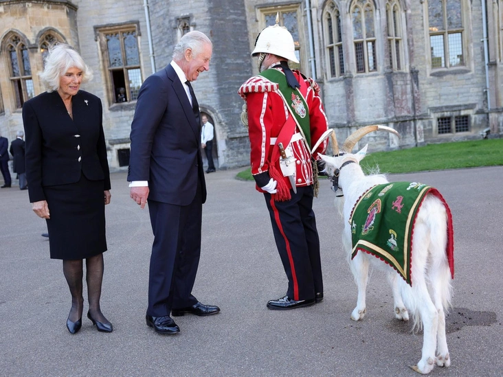 Одни из первых снимков Карла и Камиллы в новом статусе были сделаны во время их перемещения по Соединенному Королевству после смерти Елизаветы II. На этой фотографии запечатлен момент, когда Карл III и королева-консорт встречаются в валлийском замке Кардифф с Шейнкином IV, козьим талисманом третьего валлийского королевского батальона.