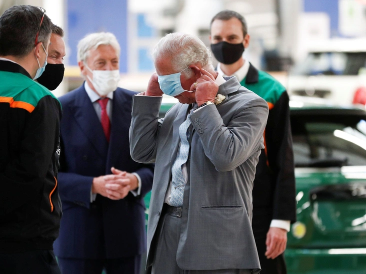 За время пандемии репортеры неоднократно запечатлевали Чарльза в смешном положении, когда наследник надевал медицинскую маску, чтобы войти в помещение, соблюдая все официальные требования. На фотографии он на заводе MINI в Оксфорде в 2021 году после выступления, посвященного британскому производству и инновациям в производстве электромобилей.