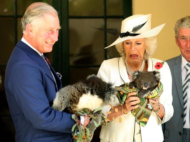 В случае королевских особ конфузы часто случаются, если во время официальных встреч на арене появляются животные, превносящие нотку неожиданности в устоявшиеся протокольные мероприятия. Этот снимок был сделан в 2012 году, когда Чарльз и Камилла были в туре по Австралии, и в Аделаиде им представилась возможность подержать на руках живых коал.