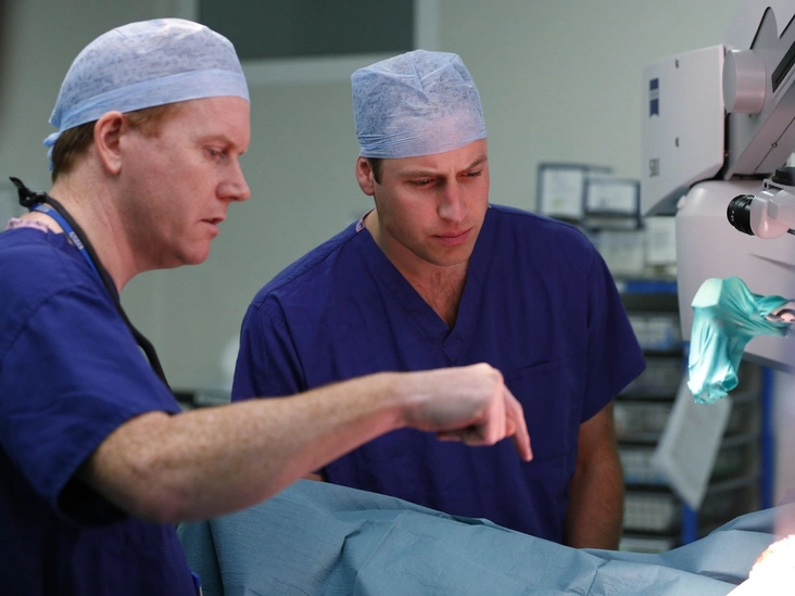По убеждению королевских поклонниц, принц Уильям прекрасно выглядит в любой форме. К счастью, он не только военный и любитель спорта, но и активно навещает всевозможные организации, где его можно увидеть в разных амплуа. Благодаря этому снимку можно составить представление о том, как Уильям выглядел бы, будь он врачом. В этот момент президент фонда Royal Marsden NHS позволил герцогу Кембриджскому наблюдать за операцией по реконструкции груди, пока ведущий хирург Стюарт Джеймс объясняет ему часть процедуры в Королевской больнице Марсдена в Челси.
