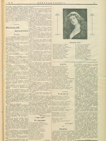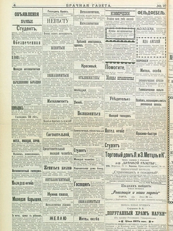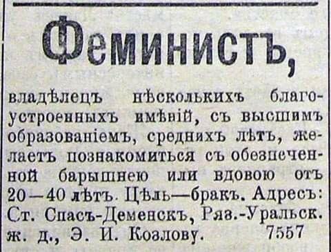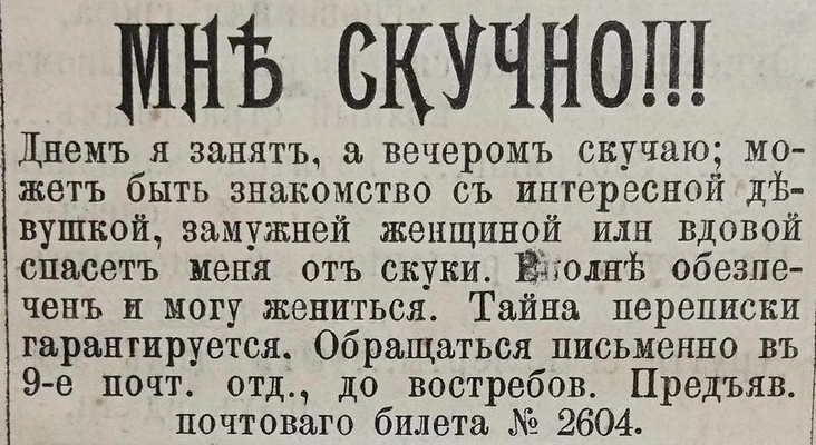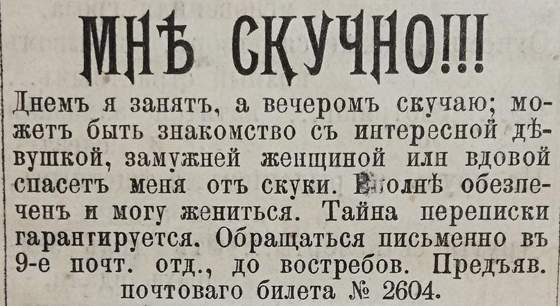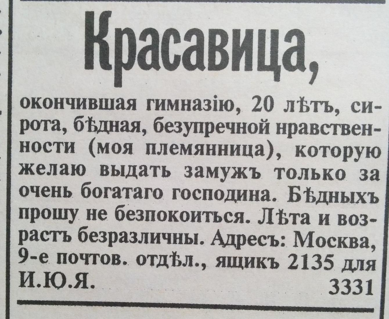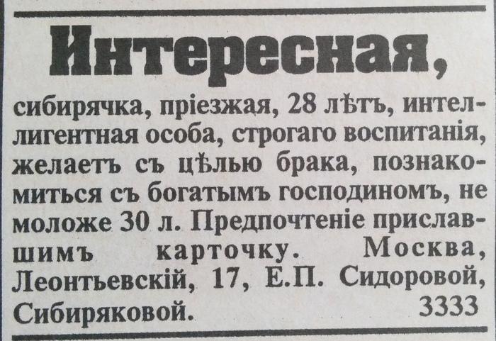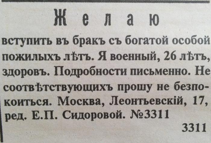 «Познакомиться желает молодой человек с барышней или вдовой от 18 до 25 лет с доброй душой, желательно помещицей. Приданое от 8 тысяч. Служу в солидном коммерческом предприятии».