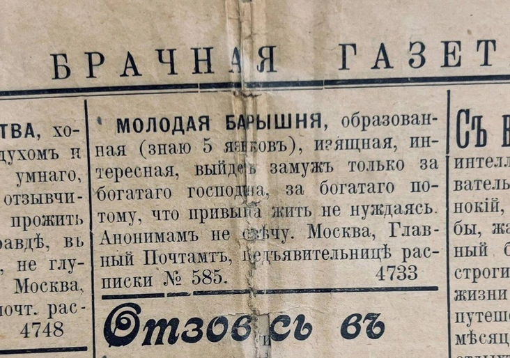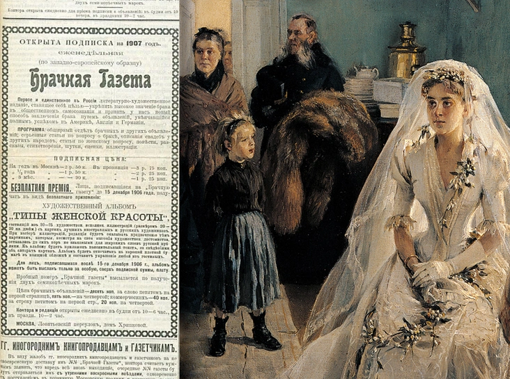 Тренд на брачные объявления появился в Германии и Англии в начале XX века — там этот способ знакомства и заключения брака считали весьма удобным. В 1906 году и в Москве появилась первая и самая популярная «Брачная газета», которая выходила по всей стране, в том числе в Туркестане, Сибири и Закавказье.