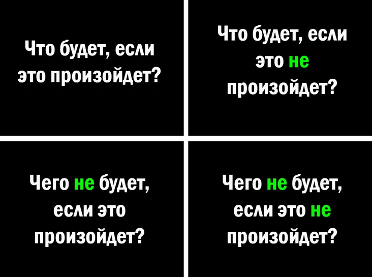 В каждом из квадратов следует написать ответ на вопрос. Ответом может быть как одна фраза, так и целый список. Данное упражнение позволяет наглядно описать принимаемое решение и его последствия. Останется лишь принять путь, который больше остальных вас устраивает.
