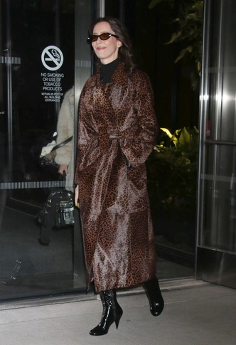 Одна из самых модных актрис современности — Ребекка Холл — выводит анималистику на новый уровень с помощью длинного лакированного тренча в мелкий леопард. Черная водолазка и глянцевые ботильоны‑чулки поддерживают вертикаль и не спорят с активным принтом, так что верхняя одежда работает как самостоятельное вечернее платье — и еще одно доказательство того, что леопард в 2026‑м не сдает позиций, а просто становится более драматичным и архитектурным.