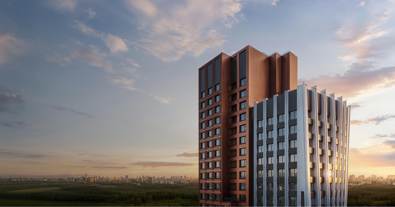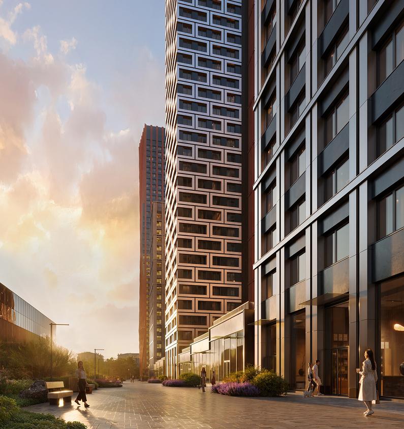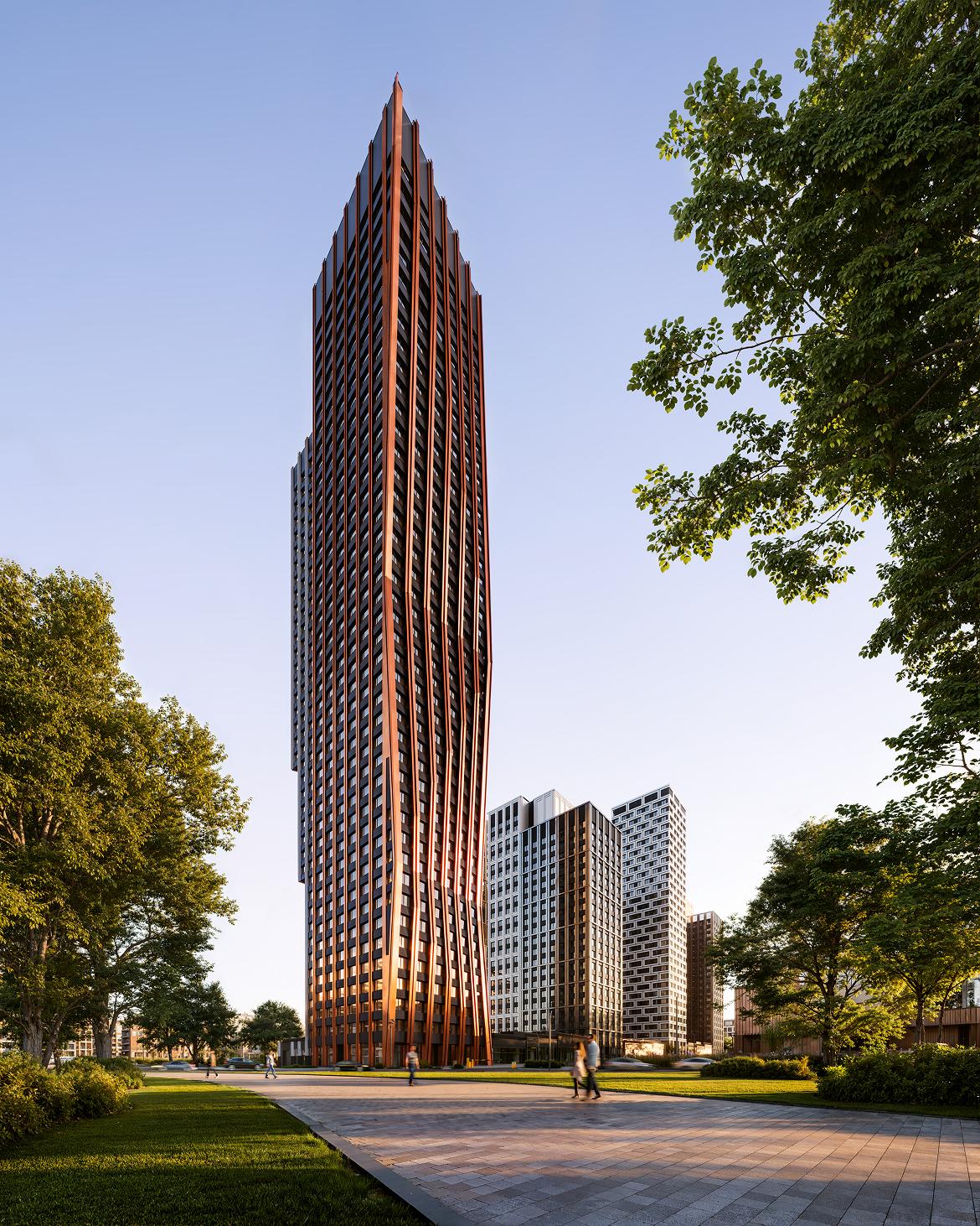 «Архитектура комплекса отражает наше время с его интересом к активным силуэтным формам и развитым общественным пространствам. Высота жилых башен варьируется от 24 до 43 этажей: каждая из них представляет собой сдвоенный объем, в котором части по своей форме и облицовке контрастны по отношению друг к другу. Такое решение позволяет придать комплексу большее визуальное разнообразие», — рассказал автор проекта и сооснователь бюро Сергей Чобан.