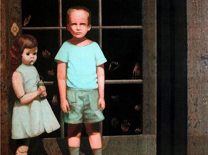 Прежде всего, девочка в интерпретации художника превратилась в безжизненную куклу с шарнирными руками и ногами. Мальчик изображен с очень странным выражением лица, а холодный прямой взгляд его темных глаз будто бы проникает в душу каждого, кто смотрит на картину. Приглядевшись пристальнее, можно заметить самый страшный фрагмент изображения — руки, которые отпечатались по обратную сторону стекла прямо за мальчиком и девочкой-куклой. Все эти детали, собранные воедино, создают гнетущее впечатление.