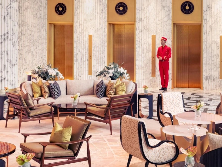 Каждая деталь — как сцена из ретрофильма: скульптурные светильники, созданные итальянскими мастерами, лифты в стиле 50-х, сияющие модернизированные арабески и выверенные мраморные узоры под ногами. Здесь не просто остановишься — здесь оказываешься в прошлом, которое снова стало актуальным.