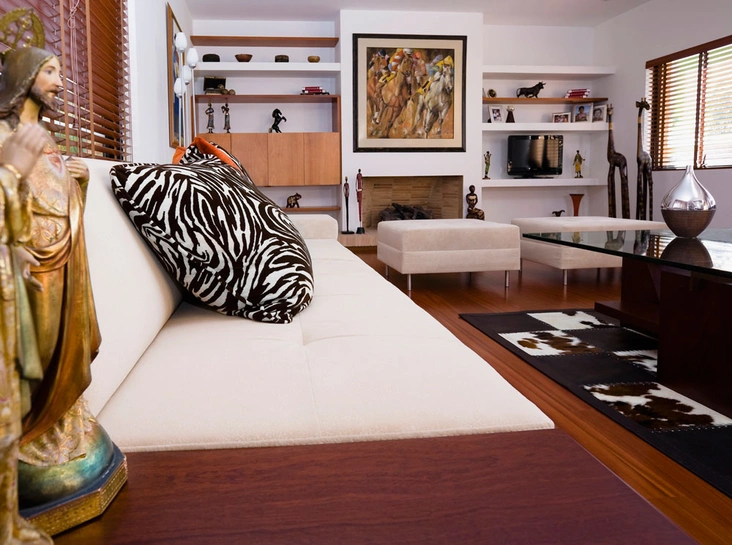 Эти предметы интерьера сделают даже минималистичный интерьер мягким и живым. Но подушки не должны быть маленькими и плоскими: выбирайте размер не меньше 50*50 см и 20 см в ширину. А пледы — слишком яркими и разноцветными. Подушки легче всего подбирать к однотонному дивану: к светлому берите на 2-3 тона темнее, темному — яркие и красивые. Если сложно с выбором, лучше остановиться на одном цвете, но взять разные фактуры и цвета. Важно избегать разномастности: нельзя чтобы одни били спринтом, другие с геометрическим рисунком, а третьи — с бахромой. Придерживайтесь единого стиля.