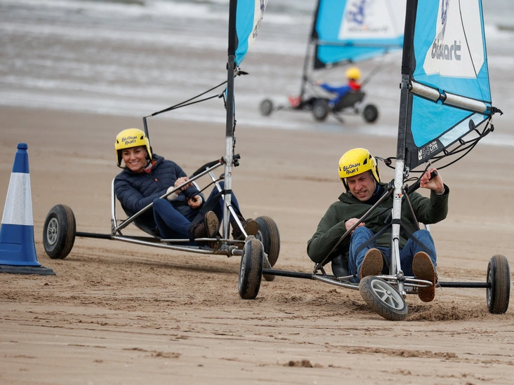 Посещая свой родной университет Сент-Эндрюс в мае 2021 года и встречаясь с сообществом Fife Young Carers супруги решились на необычное развлечение — катание на наземных яхтах на пляже Вест-Сэндс. В турне герцогиня Кэтрин демонстрировала не только элегантные платья длины миди, но и джинсы и даже кепки (читайте также: Клетка, джинсы и костюмы: все наряды герцогини Кейт в туре по Шотландии).