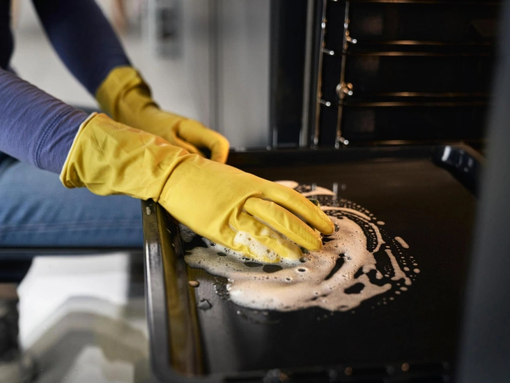 Вместо того чтобы задыхаться едким химическим средством, смешайте обыкновенные уксус и соду и натрите этой смесью духовку как внутри, так и снаружи. Оставьте ее в покое минимум на двадцать минут, а затем тщательно протрите, вспенивая самодельное средство. Смывайте его водой, пока не увидите чистую блестящую поверхность.