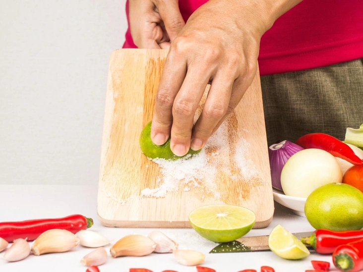 Все уже давно в курсе, что химикатами очищать разделочные доски довольно опасно с учетом того, как быстро дерево может их впитать. Но обходиться одним только моющим средством тоже не выход, поскольку многие игнорируют совет по приобретению нескольких досок сразу и довольствуются одной, нарезая на ней и фрукты, и мясо. А это уже чревато проблемами со здоровьем, если незримо оставшиеся на поверхности бактерии из сырого мяса попадут на те же фрукты. Чтобы этого не случилось, посыпьте деревянную поверхность солью любого помола и счищайте ее сверху вниз половинкой цитрусового.