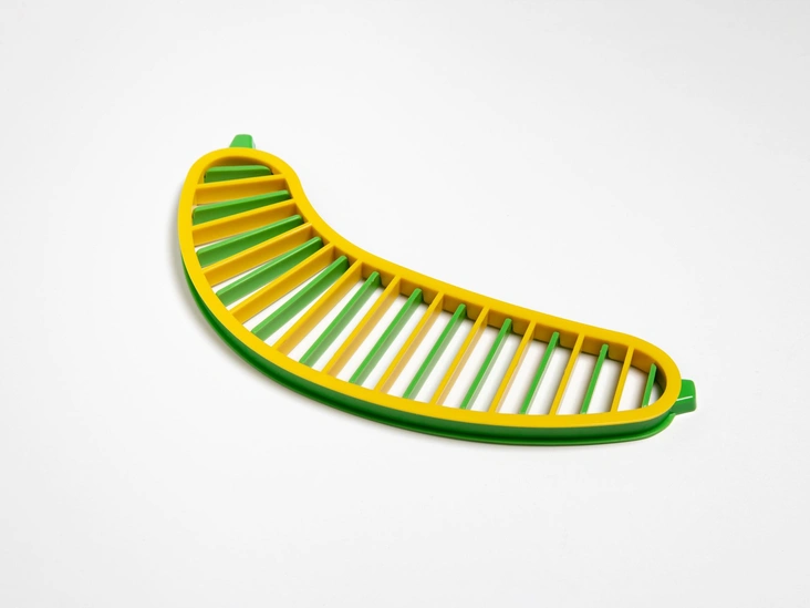 Банановый слайсер имеет форму банана, скругленную и изогнутую, и одним нажатием делает идеально однородные ломтики. Казалось бы — это так здорово. Однако не все бананы одного размера. Да и зачем вам идеально симметричные ломтики? Вам точно хватит ножа, чтобы нарезать любой фрукт.