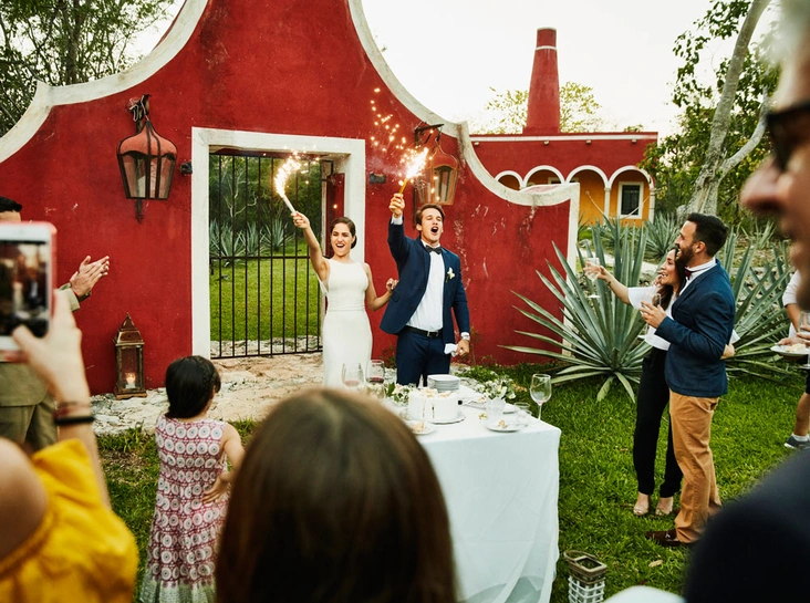 Если ваш внутренний ребенок настойчиво просит дать волю фантазии, не отказывайте ему. Волшебные деревья карточных мастей, пышные белые скатерти и нежные гортензии перенесут гостей в настоящую сказку. А тележки путешественников с угощениями напомнят путь во Дворец Принцессы.