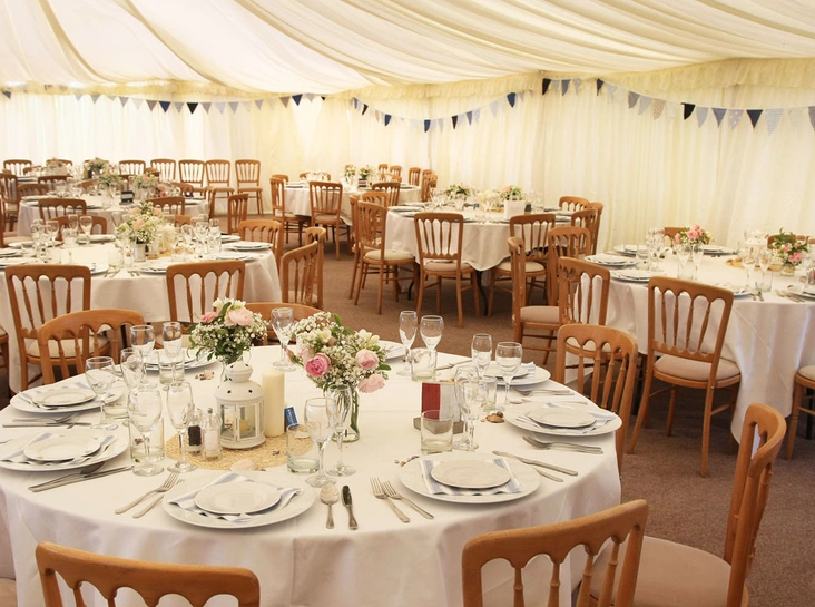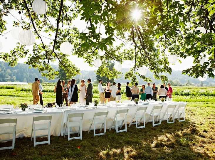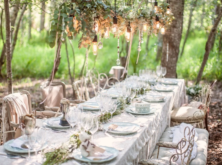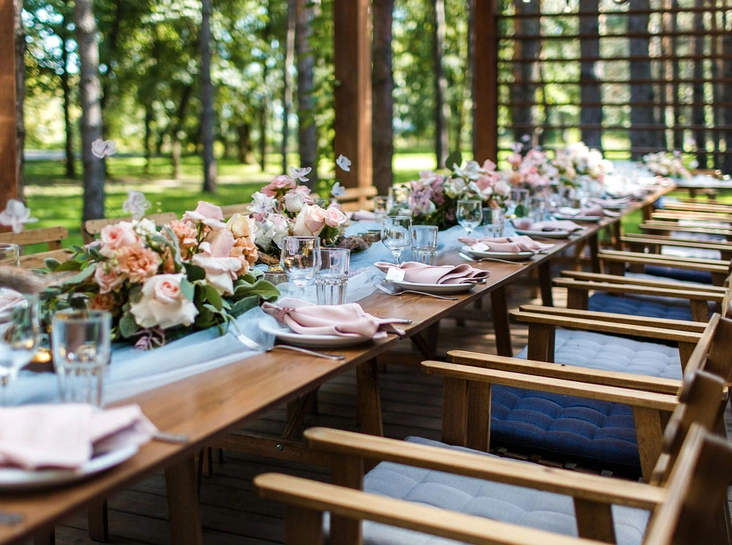 1. В случае свадьбы на природе, выбирайте место с древним поместьем. Столы украшайте композициями из зеленых ветвей и живых цветов. Обыграть место регистрации можно с помощью символа кольца и начала супружеской жизни – круга из живых веток и цветов.