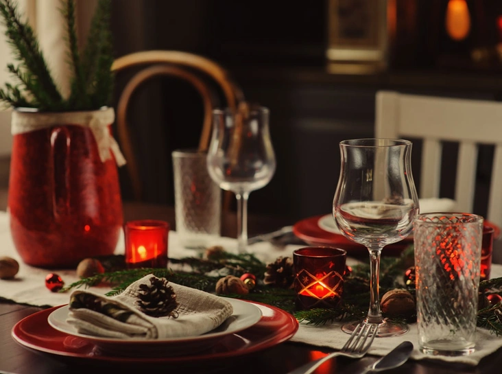 Можно сделать фон из всех необходимых атрибутовзимней сказки: тысячи глянцевых кружков, будто падающие снежини, и красные элементы декора для праздничного настроения. И немного волшебства: ландыши на столах, невероятные импровизированные елки из шерстяных клубков и ниток, игрушечные лесные животные, прячущиеся за снежными комьями снега.