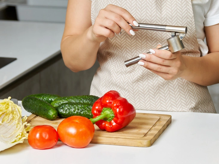 Пресс для чеснока — очень удобная кухонная утварь. Возможно, вы будете удивлены, что перед тем, как положить чеснок в пресс, его не нужно очищать от шелухи. Просто положите чеснок и надавите на пресс, чешуя останется внутри него, и только нужная внутренняя часть будет выдавлена через небольшие отверстия.