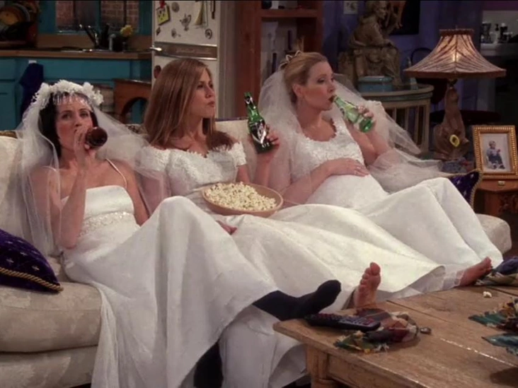 Но главным акцентом серии стал забавный момент, в котором Моника, Рейчел и Фиби облачились в свадебные платья — эта сцена стала по-настоящему культовой.