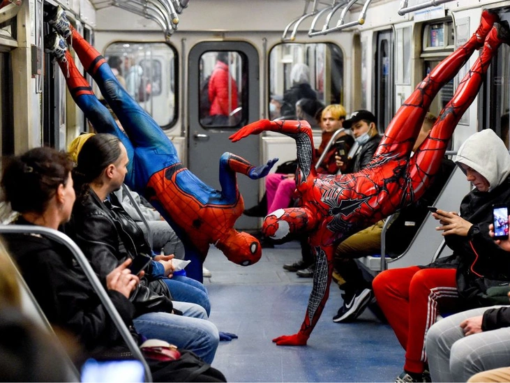21 мая. Танцоры в костюмах супергероев в метро Санкт-Петербурга.