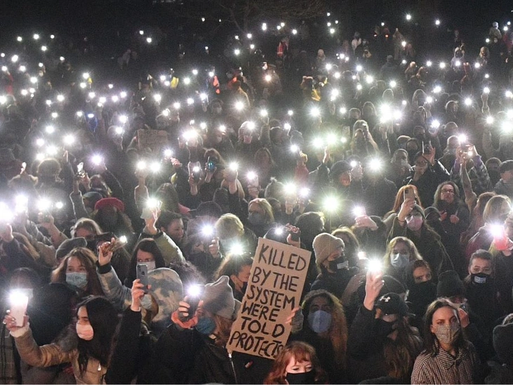 13 марта. Акция памяти Сары Эверард — 33-летней англичанки, которая пропала в начале марта. По подозрению в ее убийстве был арестован офицер столичной полиции Уэйн Кузенс. Через несколько месяцев он услышит судебный вердикт «виновен» и получит наказание в виде пожизненного заключения без права досрочного освобождения.